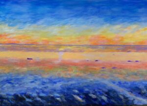 Sommerabend am Watt, Öl auf Leinwand, 50cm x 70cm,Priel, 2024, 30×40 cm, Öi auf PapierAblaufendes Wasser, 2017, 50×70 cm, Öl auf Leinwand